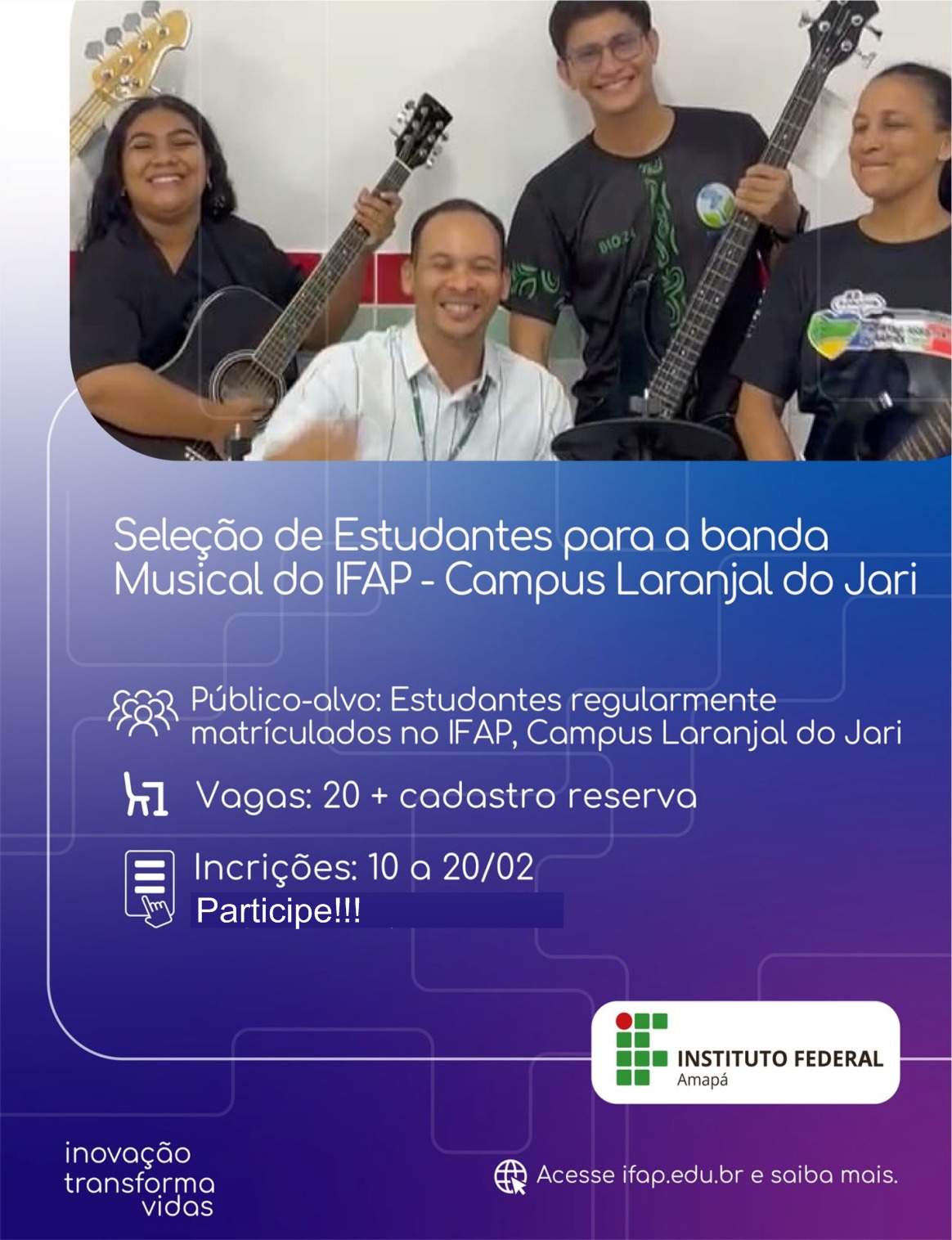 Se você ama música, essa é a sua chance de representar o IFAP e desenvolver ainda mais seu talento!